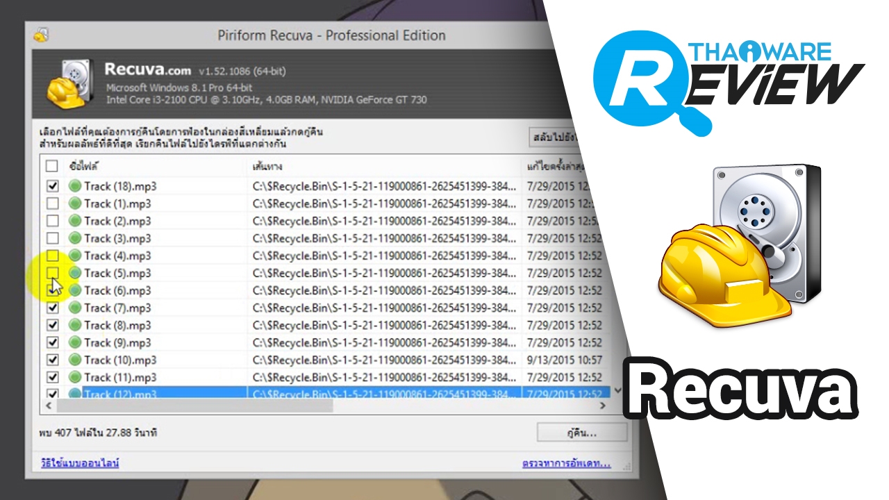 Thaiwareวันนี้ทางไทยแวร์จะมาแนะนำโปรแกรม กู้ไฟล์ ยอดนิยม ! ที่มีชื่อว่า Recuva เจ้าโปรแกรม รีคูว่านี้ ออกเสียงคล้ายๆ รีโคฟเวอร์ ที่แปลว่ากู้ เอากลับคืนมานั่นเอง พัฒนาโดยค่าย Piriform เจ้าของเดียวกับ CCleaner เจ้าโปรแกรม Recuva สามารถกู้ไฟล์ได้อย่างง่ายดาย หลากหลายประเภทไม่ว่าจะเป็นไฟล์ รูปภาพ ไฟล์เพลง mp3 เอกสารต่างๆ ก็สามารถกู้ได้หมดเลยล่ะ