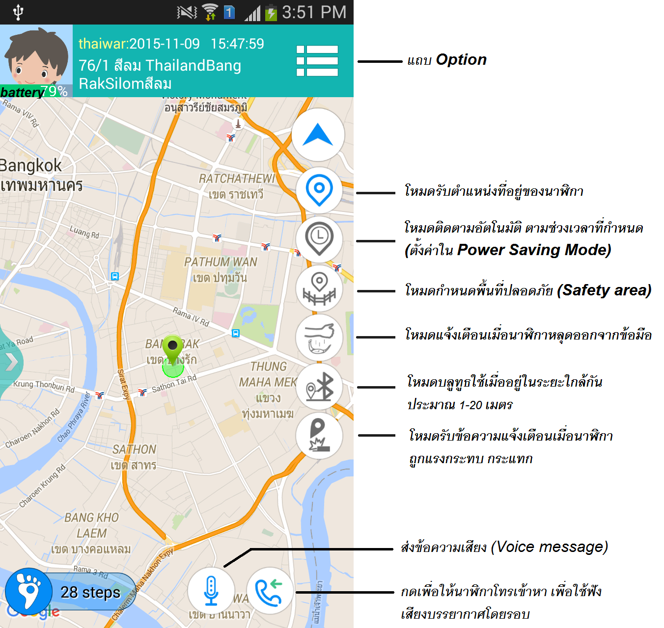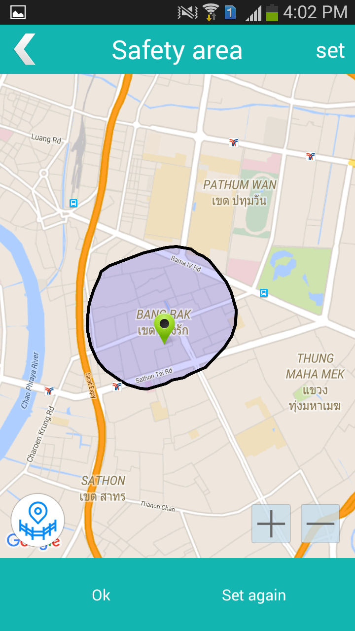 การกำหนดพื้นที่ปลอดภัย (Safety area) ถือเป็นฟีเจอร์เด็ดเลยทีเดียว เราสามารถตั้งขอบเขตของพื้นที่ปลอดภัยที่เด็กของเราควรจะอยู่ โดยใช้มือลากขอบเขตของพื้นที่ได้อย่างอิสระ ตัวอย่างเช่นในรูปลองวาดเป็นวงกลมในเขตบางรัก