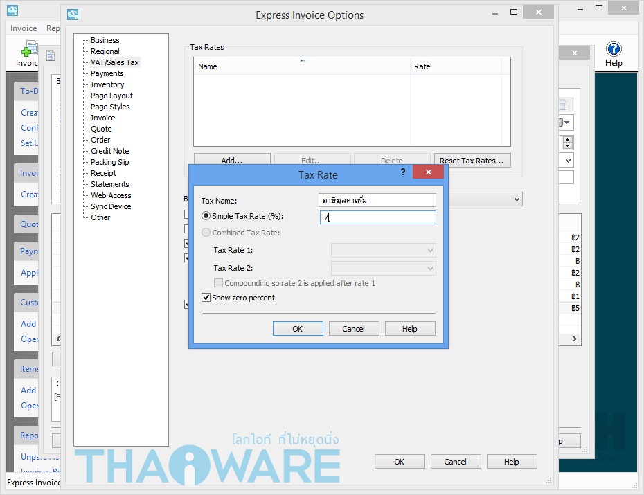 สิ่งที่ควรทำลำดับต่อมา คือการเข้าไปเพิ่ม ภาษีมูลค่าเพิ่ม เพื่อการนำไปคำนวณราคาสินค้าในใบกำกับภาษี โดยไปที่แถบเมนู Tools > Options > VAT/Sales Tax > คลิกที่ปุ่ม Add ก็จะปรากฏหน้าต่าง Tax Rate ตามภาพด้านบน ให้กรอกรายละเอียดตามภาพ แล้วคลิกปุ่ม OK เป็นอันว่าเราได้ทำการกำหนด ภาษีมูลค่าเพิ่ม 7% เข้าไปในระบบเรียบร้อยแล้ว