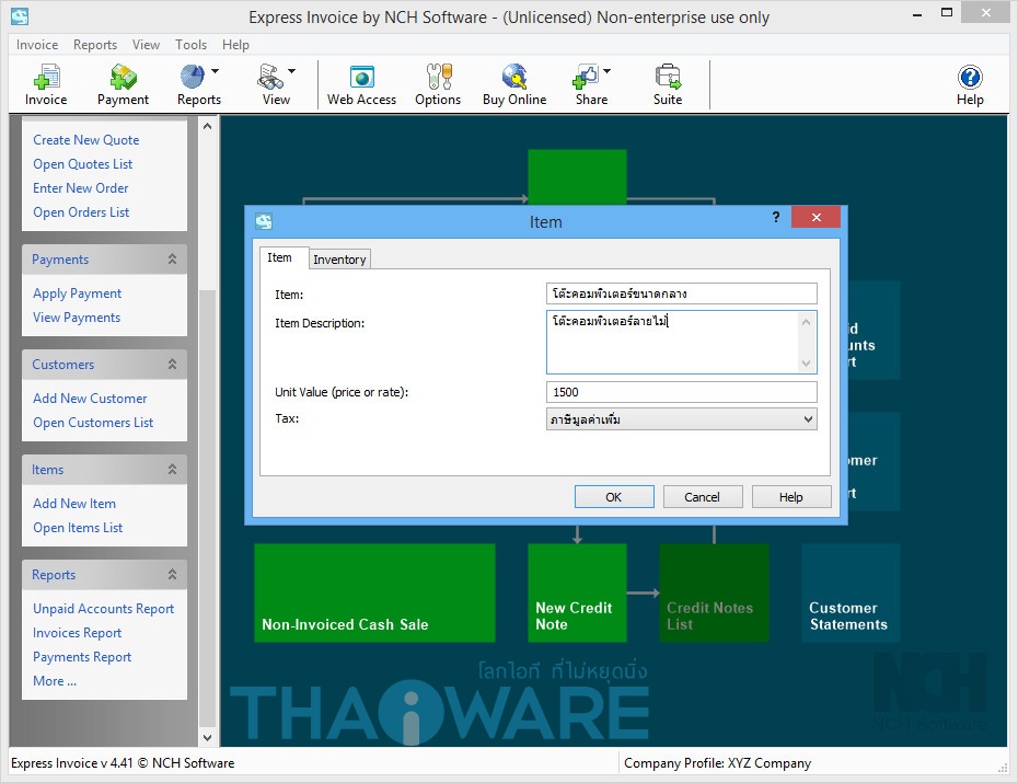 สิ่งที่ควรทำเป็นลำดับถัดมา คือนับจำนวนสินค้าคงคลังทั้งหมด แล้วป้อนข้อมูลเข้าระบบ ให้คลิกที่คำสั่ง Add New Item บนแถบเมนูทางด้านซ้ายของหน้าต่างโปรแกรม หน้าต่างเล็กๆ ตามภาพบนจะเปิดขึ้น ให้กรอกรายละเอียด ชื่อสินค้า (Item) , รายละเอียดสินค้า (Item Description) , ราคา (Unit Value) และในส่วนของ Tax ให้เลือกเป็น ภาษีมูลค่าเพิ่ม เพื่อให้มีการคำนวณราคาสินค้าบวกภาษีโดยอัตโนมัติ เสร็จแล้วให้คลิกที่แถบเมนู Inventory เพื่อป้อนข้อมูลสินค้าคงคลัง