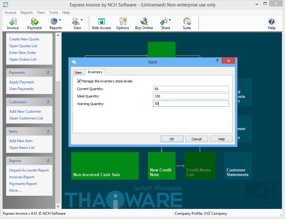 และสินค้าที่ถูกหยิบมาใส่ในใบ Invoice ก็จะถูกตัดยอดออกจากสต็อกโดยอัตโนมัติ เป็นโปรแกรมที่ใช้จัดการสต็อกสินค้าได้ดี และใช้งานง่าย แต่ถ้าหากไม่ต้องการใช้งานฟังก์ชั่นจัดการสต็อกสินค้า ก็ไม่ต้องเข้ามากรอกข้อมูลในหน้าต่างนี้ครับ