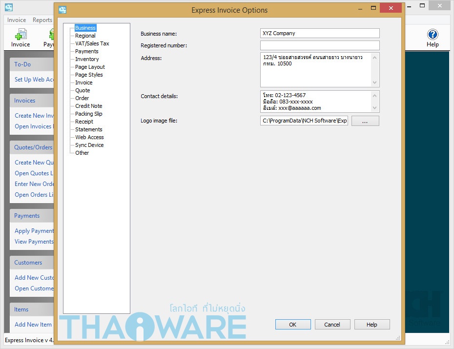 สิ่งแรกที่ควรทำหลังจากติดตั้งโปรแกรมเสร็จ คือการเข้าไปเพิ่มภาพโลโก้ของบริษัท โดยภาพโลโก้นี้จะถูกนำไปใส่ใน ใบกำกับภาษี, ใบเสนอราคา และใบสั่งขายโดยอัตโนมัติ โดยไปที่แถบเมนู Tools > Options > Business และเลือกใส่ภาพโลโก้ของบริษัทในส่วนของ Logo image file ครับ