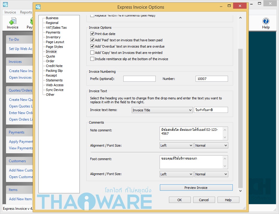 การปรับแต่งรายละเอียดบนใบกำกับภาษี ให้ไปที่แถบเมนู Tools > Options > Invoice > ในหน้าต่างนี้จะเจอหัวข้อสำหรับการปรับแต่งมากมาย อาทิ การเพิ่มชื่อพนักงานขายลงในเอกสารหรือไม่ (Print salesperson name) , การพิมพ์กำหนดวันจ่ายเงินลงในเอกสารหรือไม่ (Print due date) หรือการพิมพ์ข้อความ Paid ลงบนใบกำกับภาษีที่ลูกค้าชำระเงินแล้ว (Add "Paid" Text on invoices that have been paid) และยังมีออปชั่นอื่นๆ ให้เลือกอีกมาก