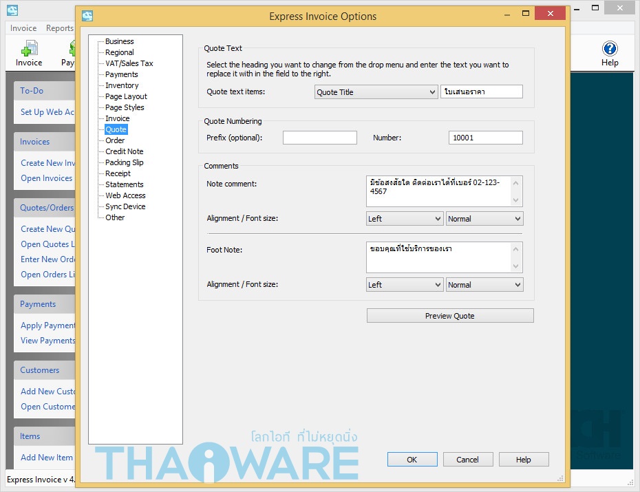 หน้าต่างการปรับแต่งรายละเอียดบนใบเสนอราคา (Quote)