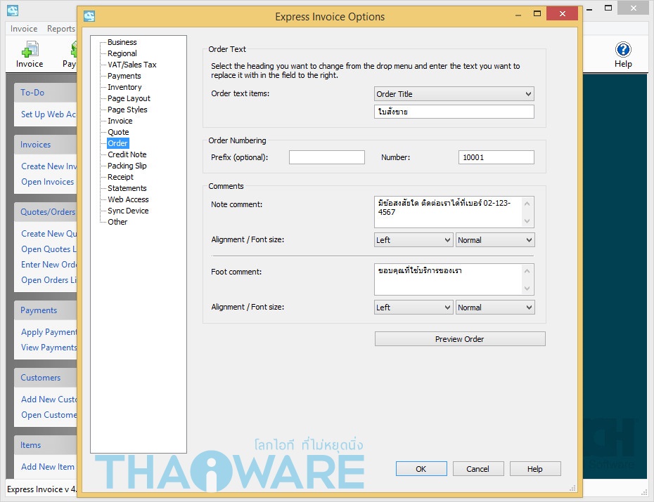 หน้าต่างการปรับแต่งรายละเอียดบนใบสั่งขาย (Order)