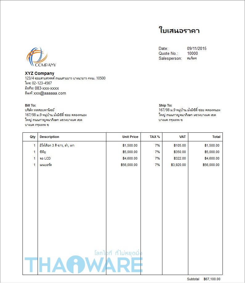 ตัวอย่าง ใบเสนอราคา ที่ออกโดยโปรแกรม Express Invoice Plus หน้าตาเรียบร้อยสวยงาม