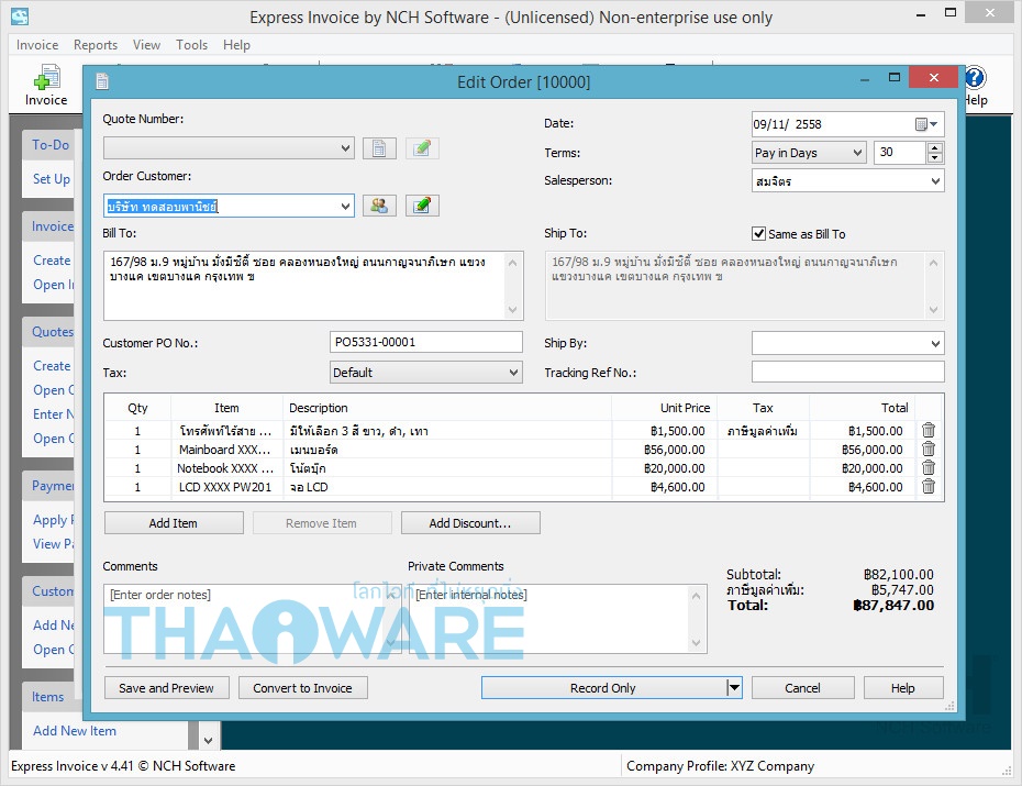 ตัวอย่าง ใบสั่งขาย ที่ออกโดยโปรแกรม Express Invoice Plus หน้าตาเรียบร้อยสวยงาม