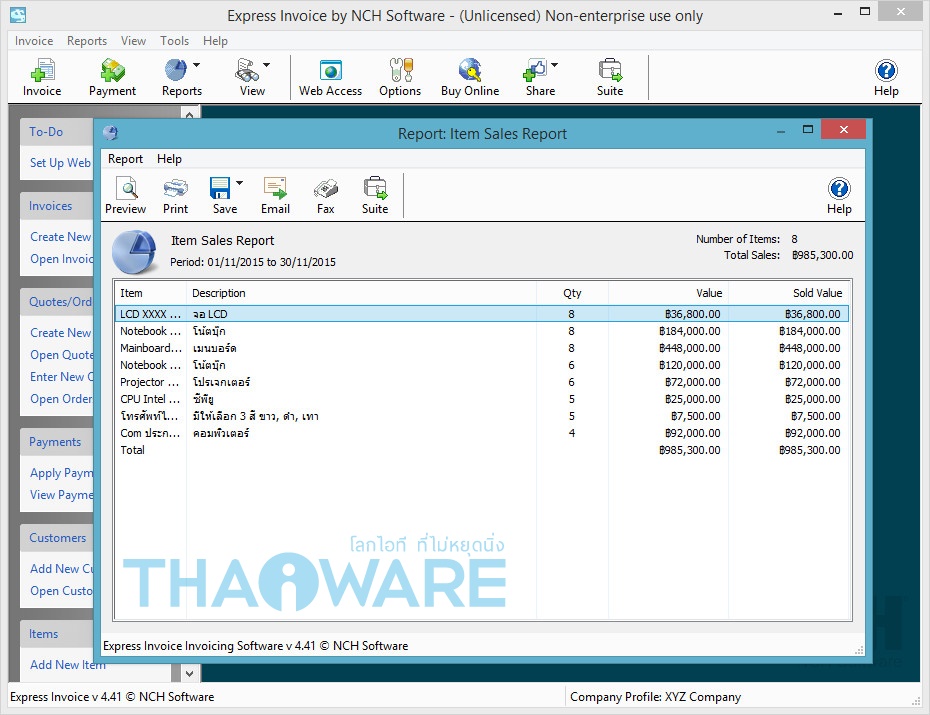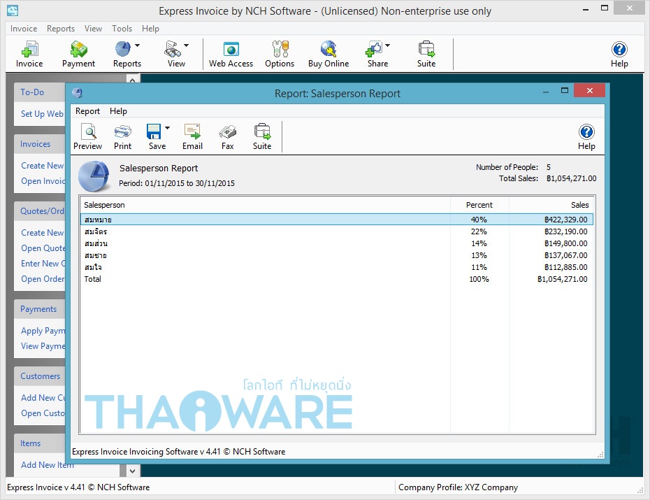 อีกหนึ่งฟังก์ชั่นที่มีประโยชน์มากของโปรแกรม Express Invoice Plus คือการเรียกดูรายงานในรูปแบบต่างๆ ที่เป็นเครื่องมือช่วยตัดสินใจในการดำเนินธุรกิจได้เป็นอย่างดี ตัวอย่างภาพข้างบนนี้เป็น รายงานยอดขายของพนักงานขายแต่ละคน สามารถกำหนดช่วงเวลาของการเรียกดูยอดขายได้ (เรียกดูได้โดยไปที่แถบเมนู Reports > Salesperson)