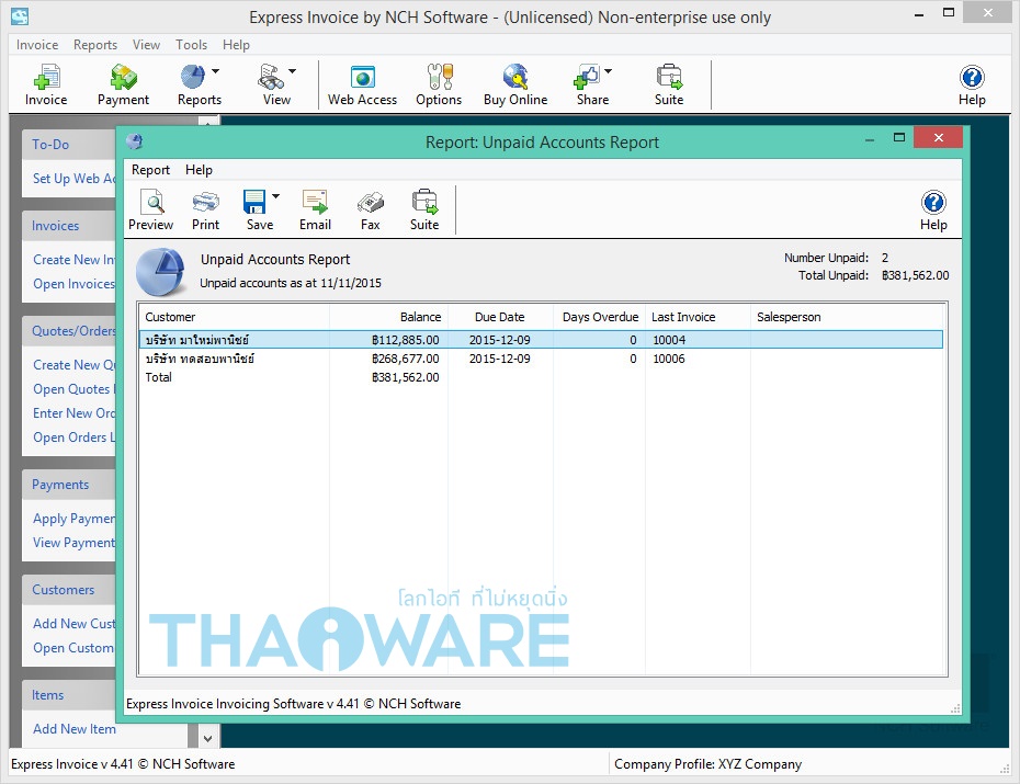 อีกหนึ่งรายงานที่มีประโยชน์ไม่แพ้กันคือ รายงานยอดหนี้ค้างจ่ายของลูกค้าแต่ละราย เป็นเครื่องช่วยในการติดตามชำระหนี้ (เรียกดูได้โดยไปที่แถบเมนู Reports > Unpaid Accounts)