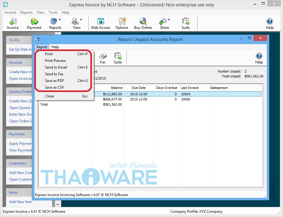 และโปรแกรม Express Invoice Plus สามารถออกรายงานได้หลายรูปแบบ ไม่ว่าจะเป็นการสั่งพิมพ์รายงาน, ส่งรายงานทางอีเมล, ส่งรายงานทางแฟกซ์, เซฟรายงานเป็น PDF รวมถึงยังสามารถเซฟรายงานเป็นไฟล์ CSV เพื่อนำฐานข้อมูลไปใช้งานร่วมกับโปรแกรมทางด้านงานบัญชีตัวอื่นๆ ได้ด้วย