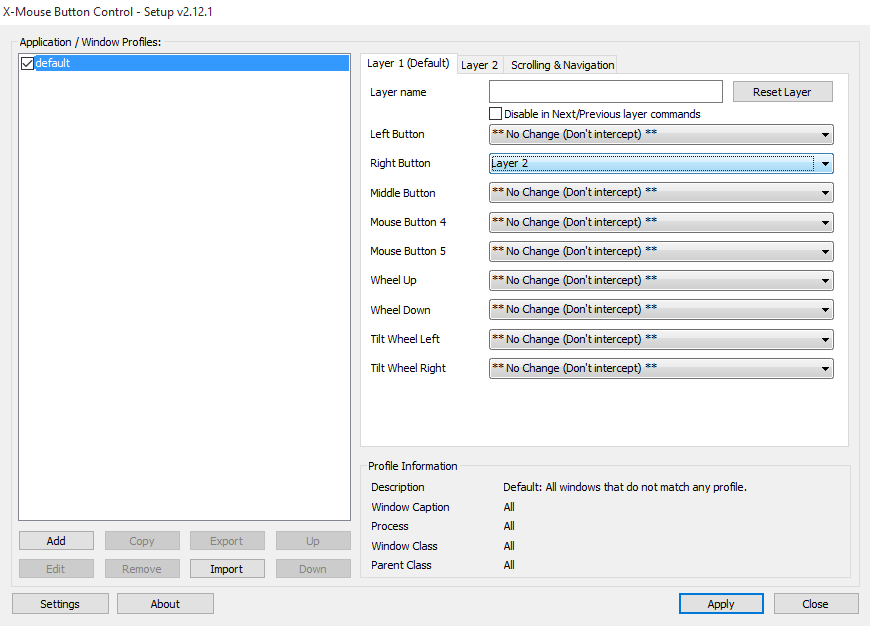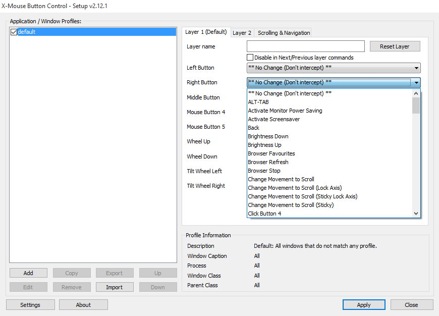 เริ่มจากตรง Layer 1 เราจะเห็นว่ามันมีคำสั่งมากมาย ในส่วนนี้เราสามารถป้อนคำสั่งที่อยากให้ทำได้ โดยเมาส์ทั่วไป จะสามารถใช้งานได้แค่ คลิกซ้าย (Left Button) , คลิกขวา (Right Button) , ปุ่มลูกกลิ้งกลางเมาส์ (Middle Button) , เลื่อนลูกกลิ้งขึ้น (Wheel Up) และ เลื่อนลูกกลิ้งลง (Wheel Down) (หมายเหตุ ไม่ควรตั้งค่าในส่วนของ Left Button เพราะจะทำให้เรากดใช้งานอะไรไม่ได้เลย) เดี๋ยวเราจะมาสาธิตในส่วนของ Right Button ให้ได้ชมกัน โดยปกติเมื่อคลิกขวาแล้วจะมีหน้าตาแบบนี้