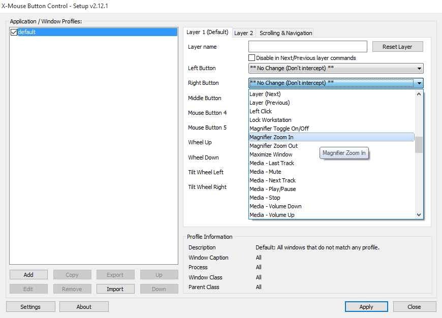เราจะมาลองใช้คำสั่ง Magnifier Zoom In ดู โดยการกดเลือกที่ตัวคำสั่งในช่องของ Right Button แล้วกดปุ่ม Apply ด้านล่างเลย