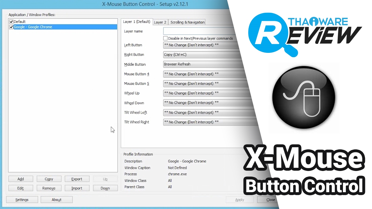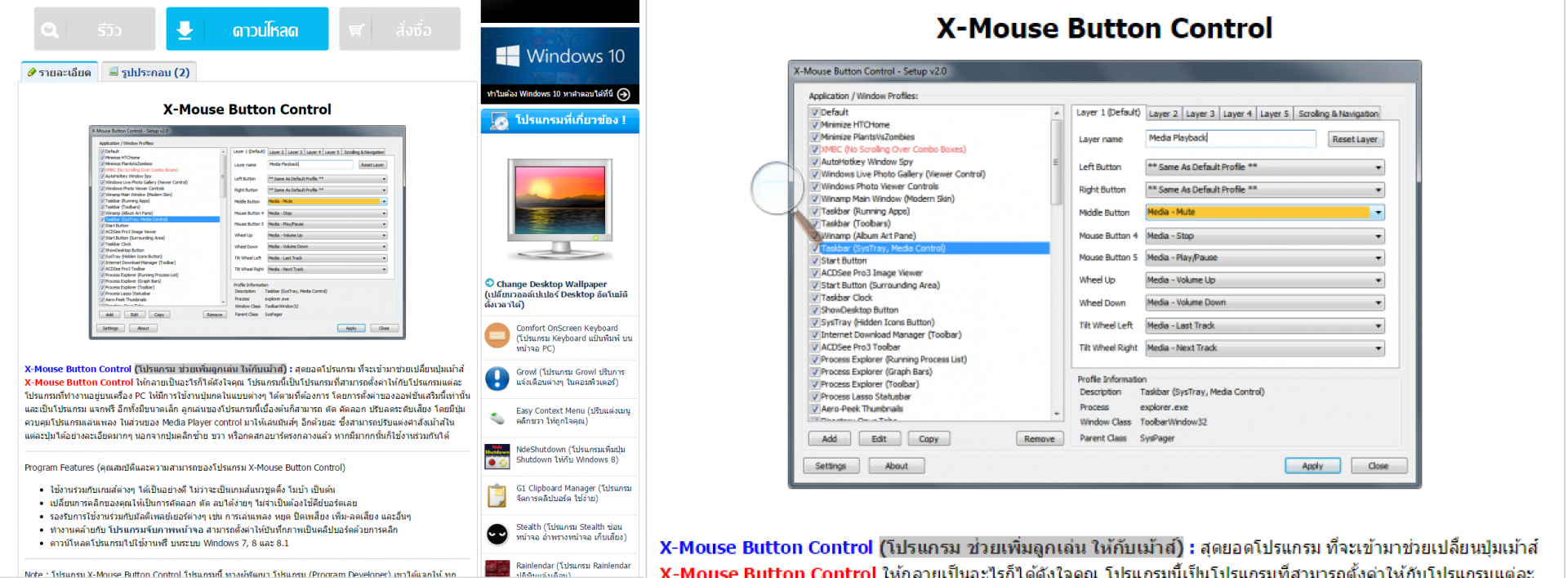 ThaiwareX-Mouse Button Control สุดยอดโปรแกรมที่จะเข้ามาช่วยเปลี่ยนปุ่มเมาส์ให้กลายเป็นอะไรก็ได้ดังใจคุณ โปรแกรมนี้เป็นโปรแกรมที่สามารถตั้งค่าให้กับโปรแกรมแต่ละโปรแกรมที่ทำงานอยู่บนเครื่อง PC ให้มีการใช้งานปุ่มกดในแบบต่างๆ ได้ตามที่ต้องการ
