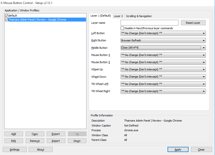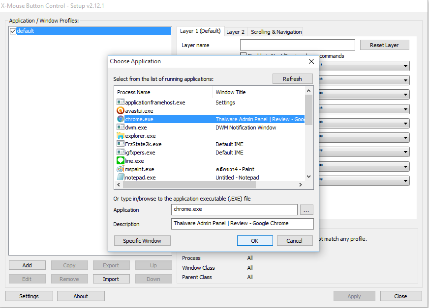 นอกจากนี้เรายังสามารถตั้งค่าให้สามารถใช้งานได้เฉพาะในตัวโปรแกรมที่เรากำหนด โดยดูตรงหัวข้อ Application / Window profiles ทางซ้ายบน และกดปุ่ม Add ด้านล่างจะมีตัวโปรแกรมที่เราเปิดอยู่ทั้งหมดขึ้นมา ซึ่งเราจะลองกำหนดคำสั่งแค่ในโปรแกรม Google Crome ดู หลังจากเลือกแล้วกด OK เลย จากนั้นเราก็จะมาตั้งค่าในส่วน Right Button และ Middle Button และปุ่มอื่นๆ ได้ตามที่ต้องการเลย