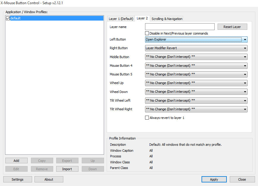 หลังจากตั้งค่าคำสั่งคลิกขวาใน Layer 1 แล้วให้ไปตั้งค่าใน Layer 2 ต่อจะลองตั้งค่าคลิกซ้ายให้เป็นคำสั่ง สั่งเปิดโฟลเดอร์ค้นหาในคอม (Open Explorer) ดู หลังจากนั้นกด Apply ได้เลย จะเห็นว่าปกติเราจะสามารถใช้งานคลิกซ้ายแบบปกติได้อยู่แต่หลังจากที่เรากดคลิกขวาค้างไว้แล้วกดคลิกซ้าย 1 ที จะเป็นการเรียกโฟลเดอร์ค้นหาตามที่เราได้ตั้งค่าไว้นั่นเอง