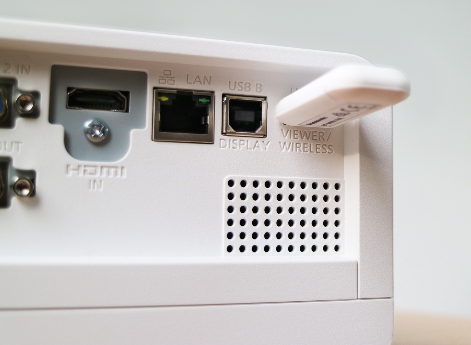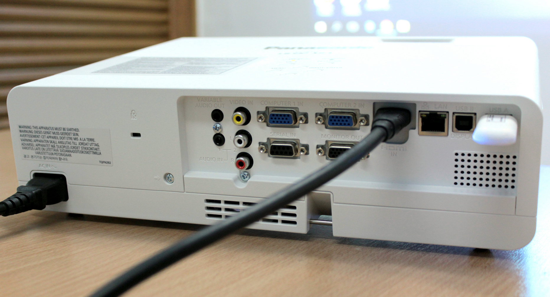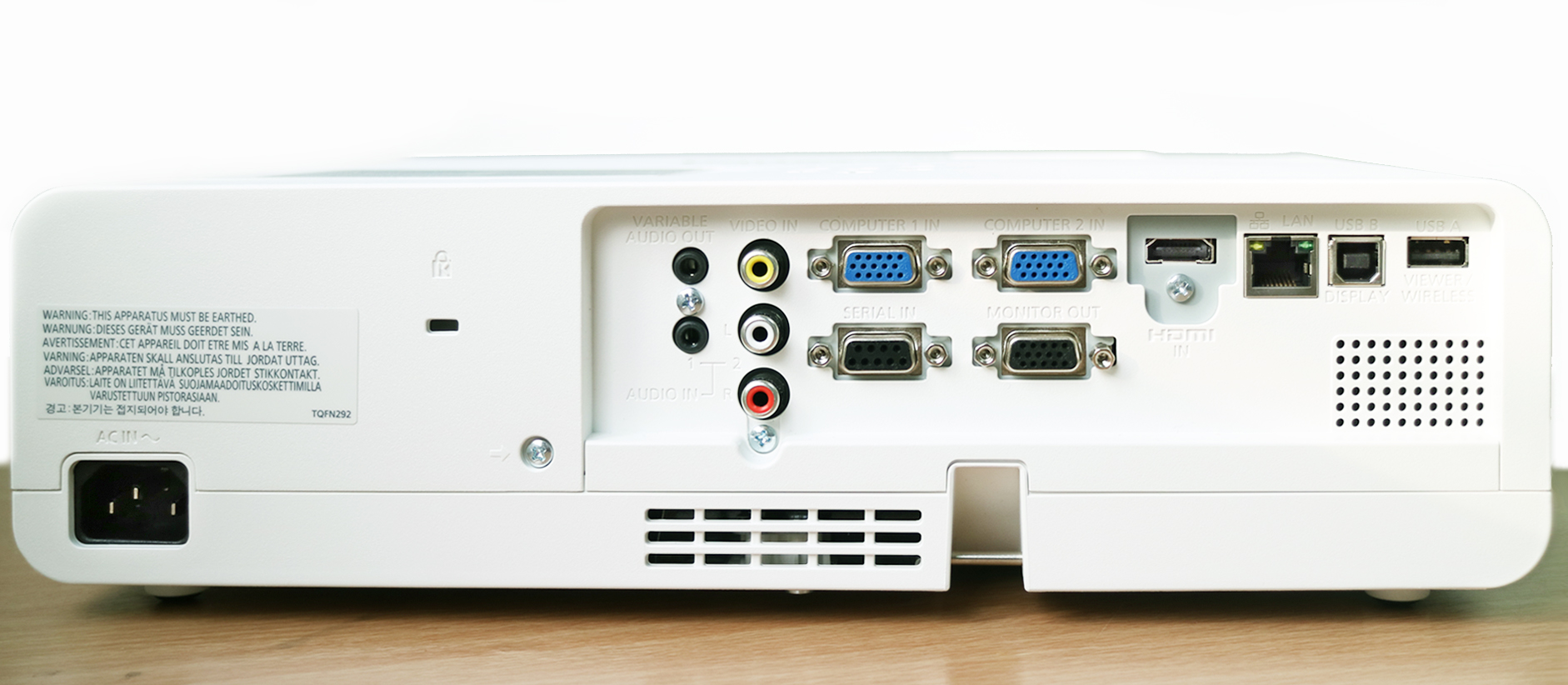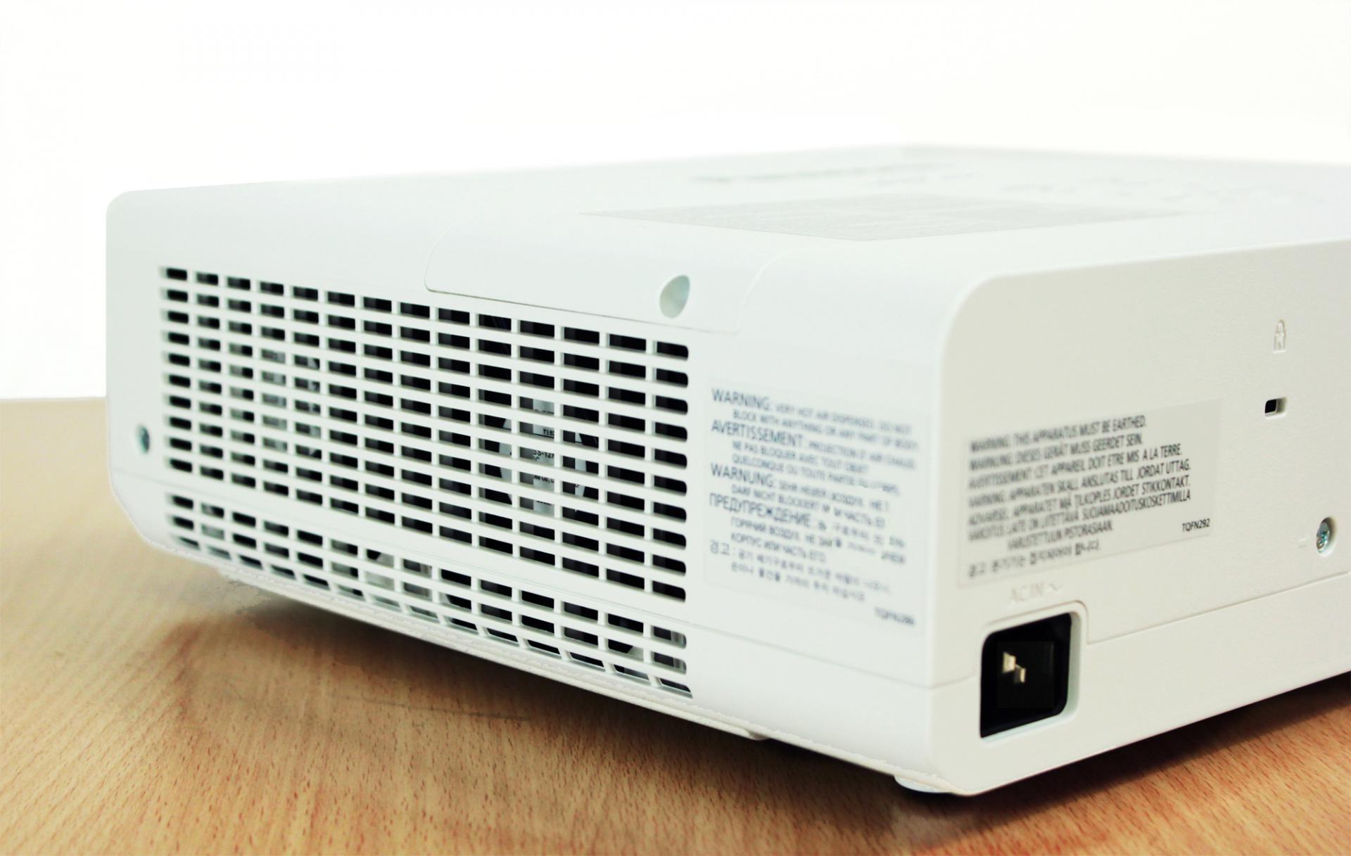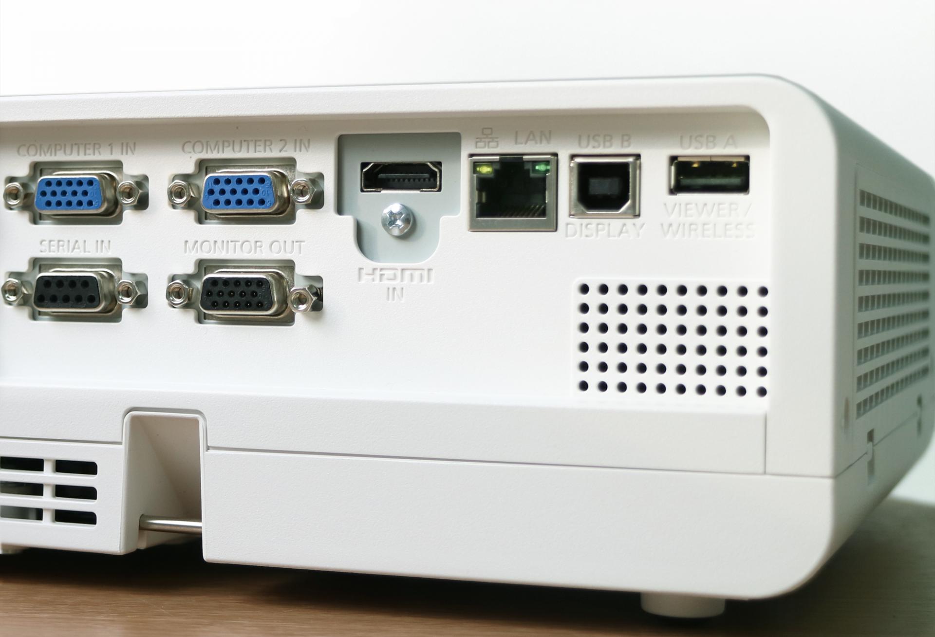 ในส่วนของบริเวณด้านหลังตัวเครื่องโปรเจคเตอร์ จะเป็นแผงการเชื่อมต่อกับอุปกรณ์อื่นๆ ซึ่งรองรับการใช้งานได้หลากหลายรูปแบบ สามารถเชื่อมต่อกับเครื่องคอมพิวเตอร์ผ่านทางสาย VGA และ HDMI พร้อมกับมีช่อง Audio In/Out เพื่อรองรับการใช้งานร่วมกับลำโพงหรือเครื่องขยายเสียงอื่นๆ นอกจากนี้ยังมีช่องเสียบสาย LAN มาให้อีกด้วย เรียกได้ว่าครบครันเลยทีเดียว