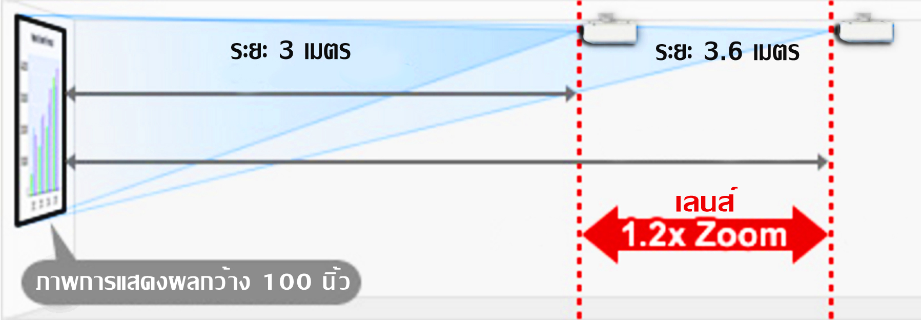 ระยะขอบเขตในการฉายภาพนั้น ใช้พื้นที่เพียงเล็กน้อยก็สามารถฉายจอภาพที่มีขนาดใหญ่ๆ ได้ ในระยะตั้งแต่ 3 เมตรเป็นต้นไป