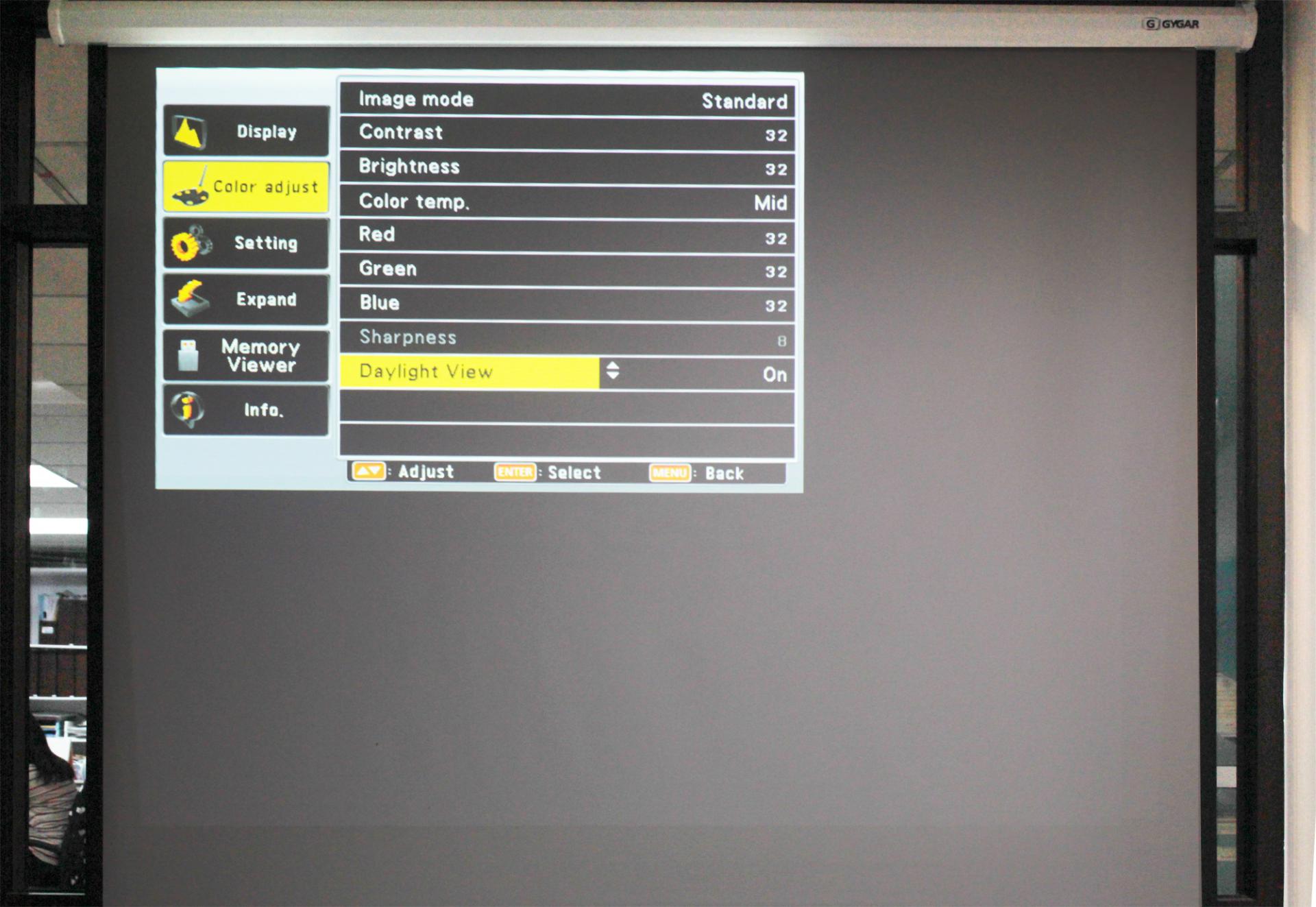 ในโหมดนี้ก็ถือเป็นโหมดที่ดีมาก สำหรับใช้งานในที่ที่มีแสงสว่างจ้า อย่างเช่นในห้องประชุมหรือห้องเรียนที่เปิดไฟสว่างๆ โดยที่โหมดนี้จะเป็นการปรับเร่งระดับของแสงในการฉายภาพเพื่อเพิ่มความสว่างและความคมชัดให้กับจอภาพได้อย่างเต็มประสิทธิภาพ สามารถเปิดการใช้ได้จากในเมนู Color adjust หรือจะกดปุ่มลัด Daylight view บนรีโมทก็ได้เช่นเดียวกัน