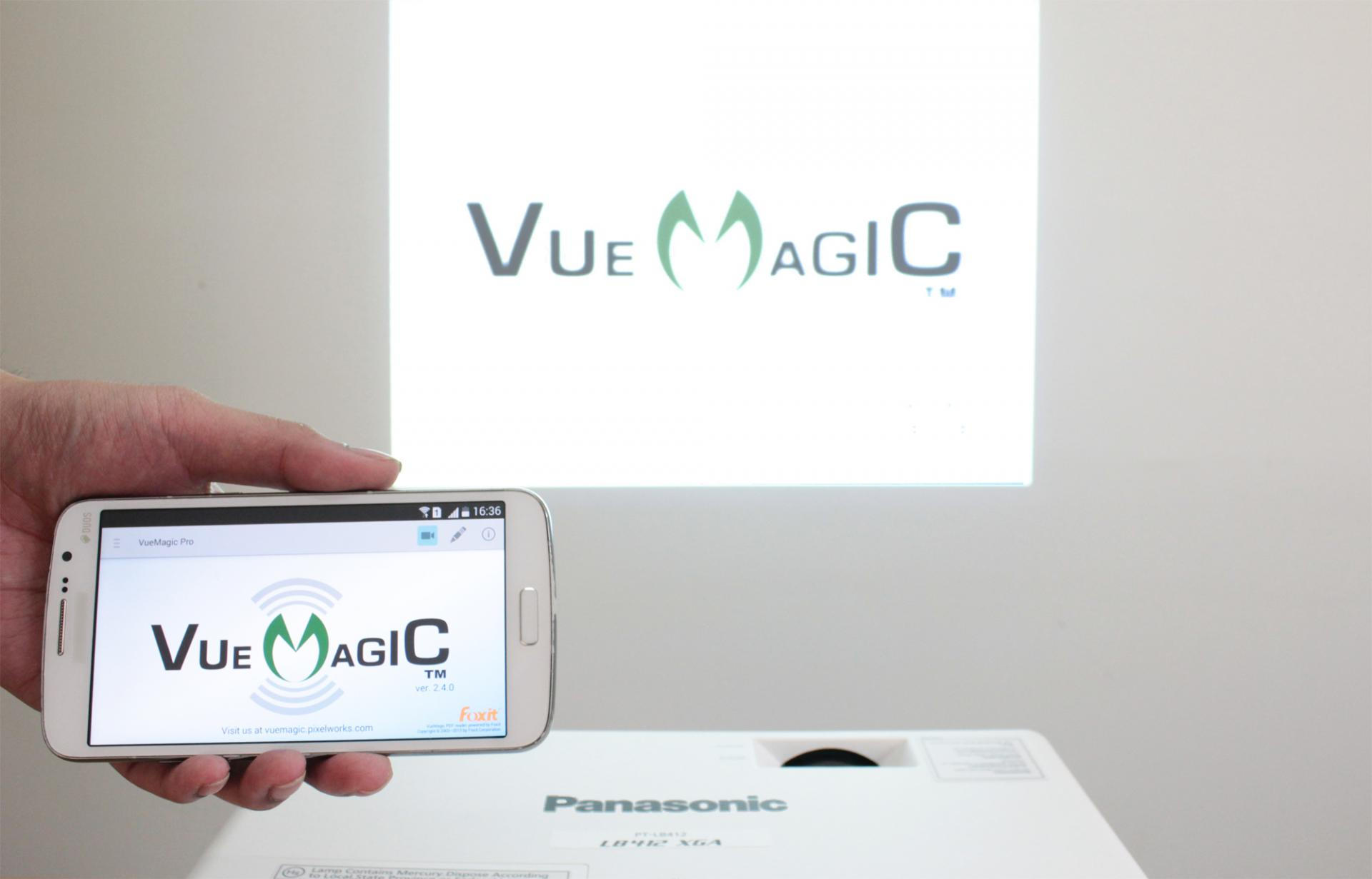 หลังจากนั้นก็เปิด แอปพลิเคชัน VueMagic Pro ในมือถือ แล้วกดไปที่สัญลักษณ์ไอคอนโปรเจคเตอร์ แล้วก็นำรหัส 4 หลักที่ได้มานั้นใส่ลงไป (สามารถกด ดาวน์โหลดแอปฯ VueMagic Pro ได้ที่นี่)
