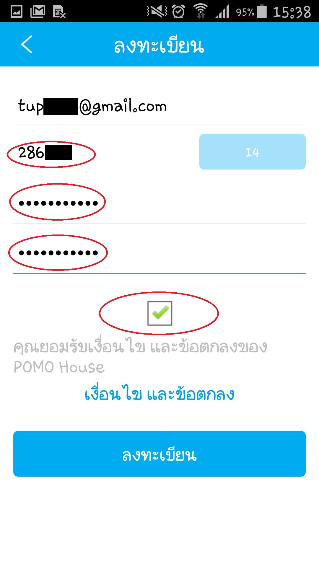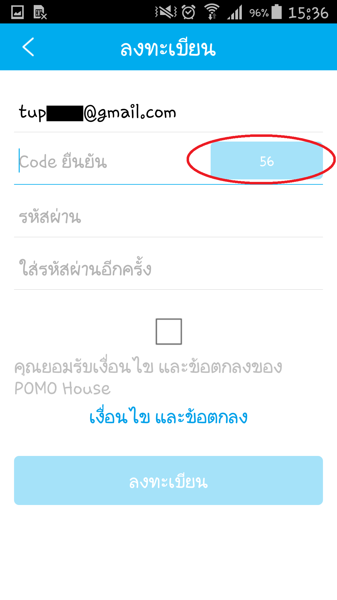ให้แตะที่ ลงทะเบียน และในหน้าจอถัดมาให้ใส่อีเมลที่ต้องการใช้ในการลงทะเบียน แล้วคลิกที่ปุ่มสีฟ้า ระบบของ POMO ก็จะทำการส่ง รหัสยืนยันการลงทะเบียน ไปที่อีเมลของเรา