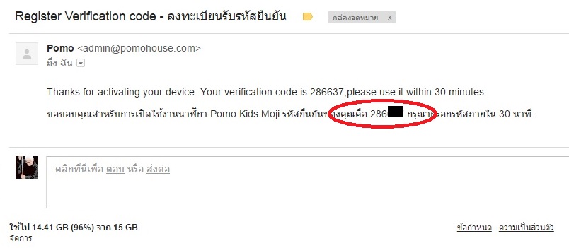 ให้เช็คอีเมลที่ทาง POMO ส่งมาให้เรา จะเห็นว่ามีการส่งรหัสยืนยันการลงทะเบียนมาให้ (เป็นเลข 6 หลัก)