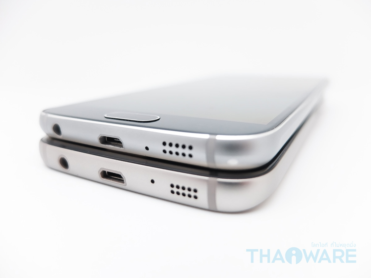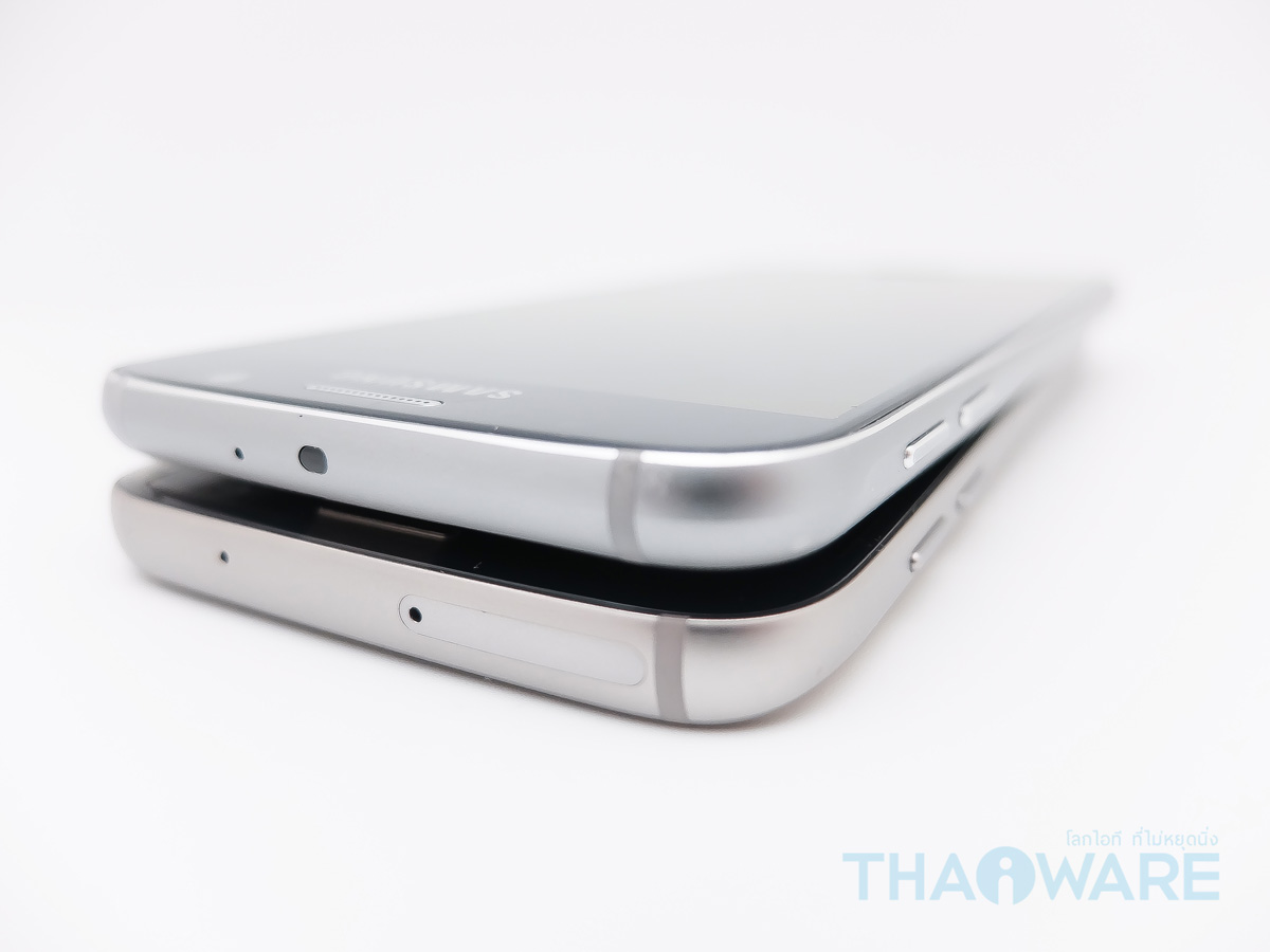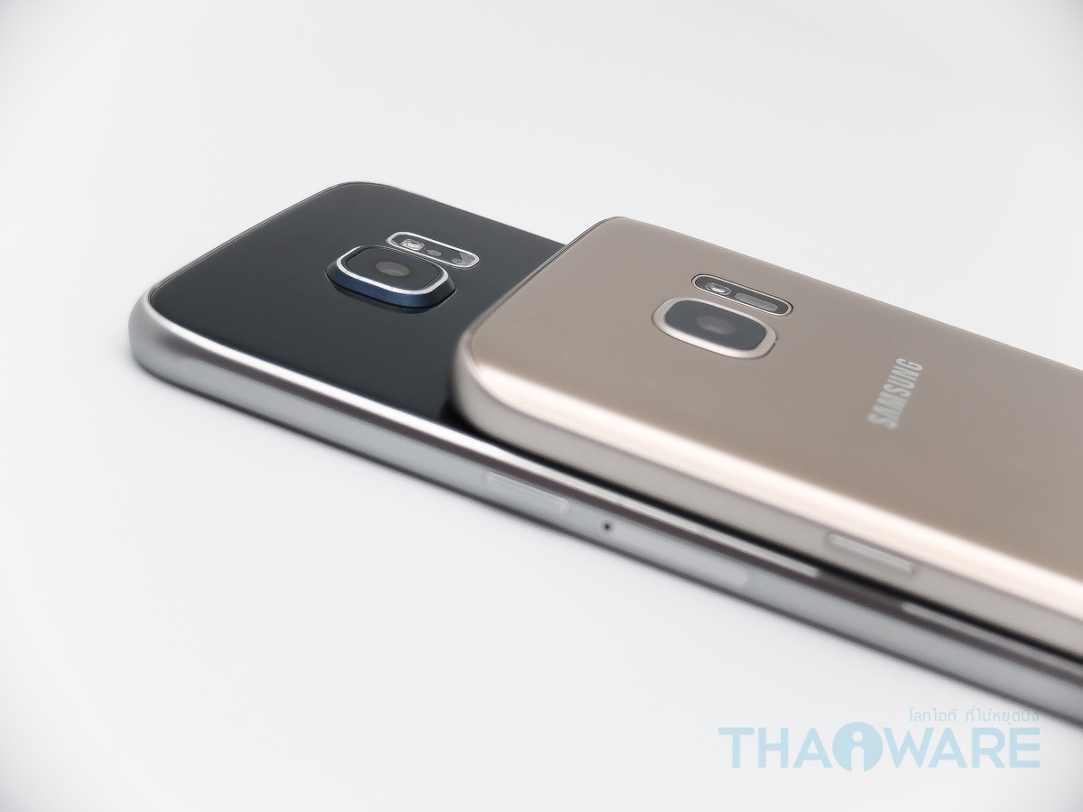 พอเปรียบเทียบกันแบบนี้ จะเห็นได้ว่าแทบไม่มีความต่างทางด้านดีไซน์เลย ระหว่าง Galaxy S6 และ S7 ซึ่งปีที่แล้วรู้สึกว่า S6 สวยยังไง S7 ก็ยังสวยอยู่แบบนั้น (แต่แอบทำให้รู้สึกเหมือน iPhone ที่เปิดตัวรุ่นปกติและเปิดตัวรุ่น s ตามมาทีหลัง) ซึ่งความแตกต่างที่สังเกตได้ชัดเจนในตอนนี้ ก็คือ ด้านหลังตัวเครื่องที่โค้งมนเหมือนขอบ Edge และกล้องหลังที่ไม่นูนอีกต่อไปแล้ว