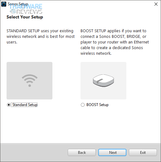 เปิดโปรแกรม Sonos Desktop Controller ขึ้นมาจะพบกับหน้าต่างแบบนี้ครับ กด Next ไปแล้วเลือก Set up New System มันจะถามเราว่าจะติดตั้งแบบ Standard Setup หรือ BOOST Setup ถ้าเรามีลำโพงตัวเดียวเลือก Standard จะเหมาะสมกว่าครับ