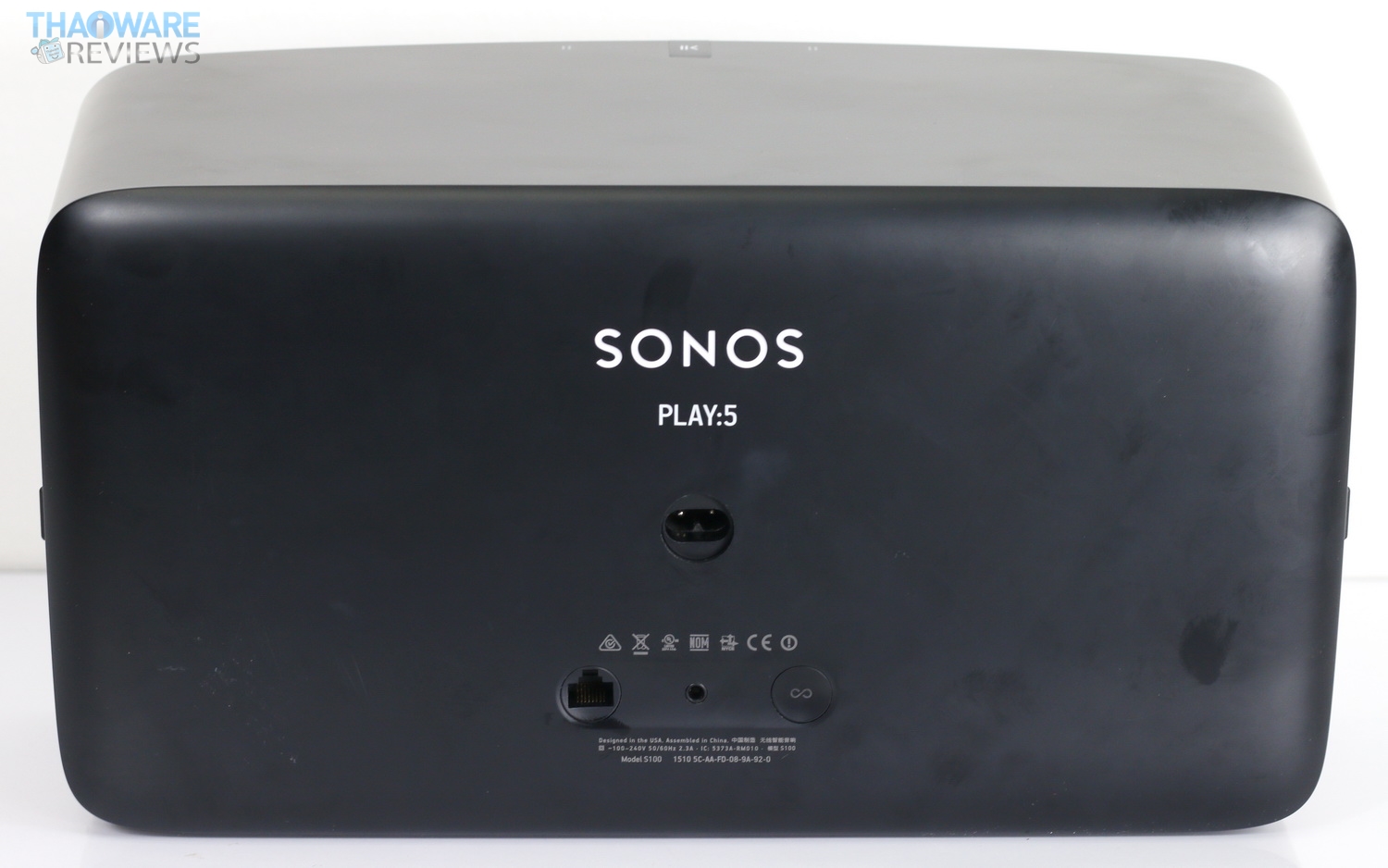 ด้านหลังของลำโพงเรียบง่าย มีรูสำหรับเสียบปลั๊กไฟ, ช่อง Ethernet port, Stereo Audio in และปุ่ม Join