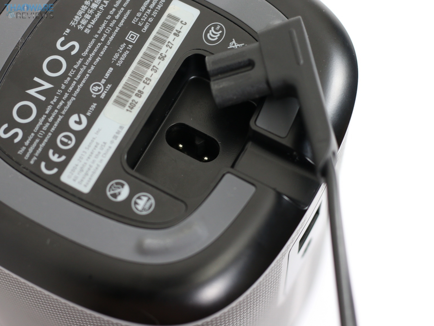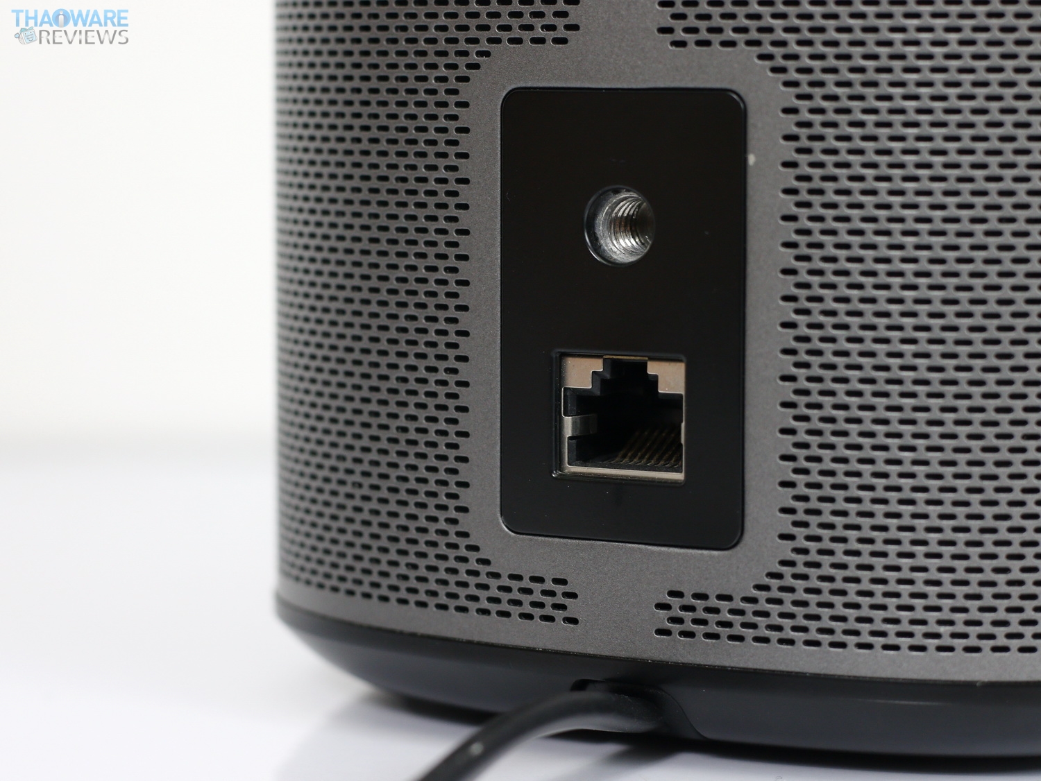 ด้านหลังมีพอร์ทสำหรับเชื่อมต่อสาย Ethernet เท่านั้น ส่วนรูที่เห็นเป็นรูสำหรับยึดเข้ากับขาตั้งหรือที่แขวนลำโพง สังเกตว่าลำโพงรุ่นนี้ไม่มีช่องสำหรับต่อสาย Line In นะครับ ถือว่าเป็นข้อเสียของลำโพงตัวนี้เลย
