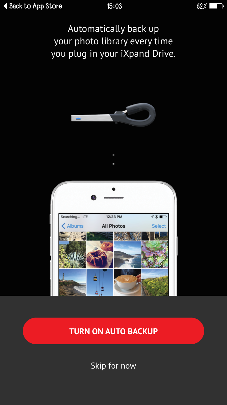 เมื่อเข้าแอปครั้งแรก เราพบว่ามีการอัพเดตเฟิร์มแวร์ให้กับตัวไดร์ฟ (ภาพซ้าย) เมื่อเสร็จเรียบร้อยแล้ว แอปจะถามเราว่าต้องการให้แบ็กอัพภาพถ่าย และคลิปวิดีโอที่ไปเก็บไว้ในไดร์ฟโดยอัตโนมัติหรือไม่ (ภาพกลาง) ก็ให้แตะเลือกที่ TURN ON AUTO BACKUP ไปเลยครับ สะดวกดี ลำดับต่อมา (ภาพขวา) แอปก็จะจัดการเรียบเรียงข้อมูลในเครื่อง iPhone/iPad ของเรา เพื่อเตรียมการแบ็กอัพ ซึ่งถ้าในเครื่องของเรามีภาพถ่ายและคลิปวิดีโออยู่เป็นจำนวนมาก ขั้นตอนการเรียบเรียงข้อมูลในครั้งแรก ก็จะใช้เวลาค่อนข้างนาน แต่ก็จะใช้เวลาสั้นลงในการแบ็กอัพครั้งต่อๆ ไปครับ
