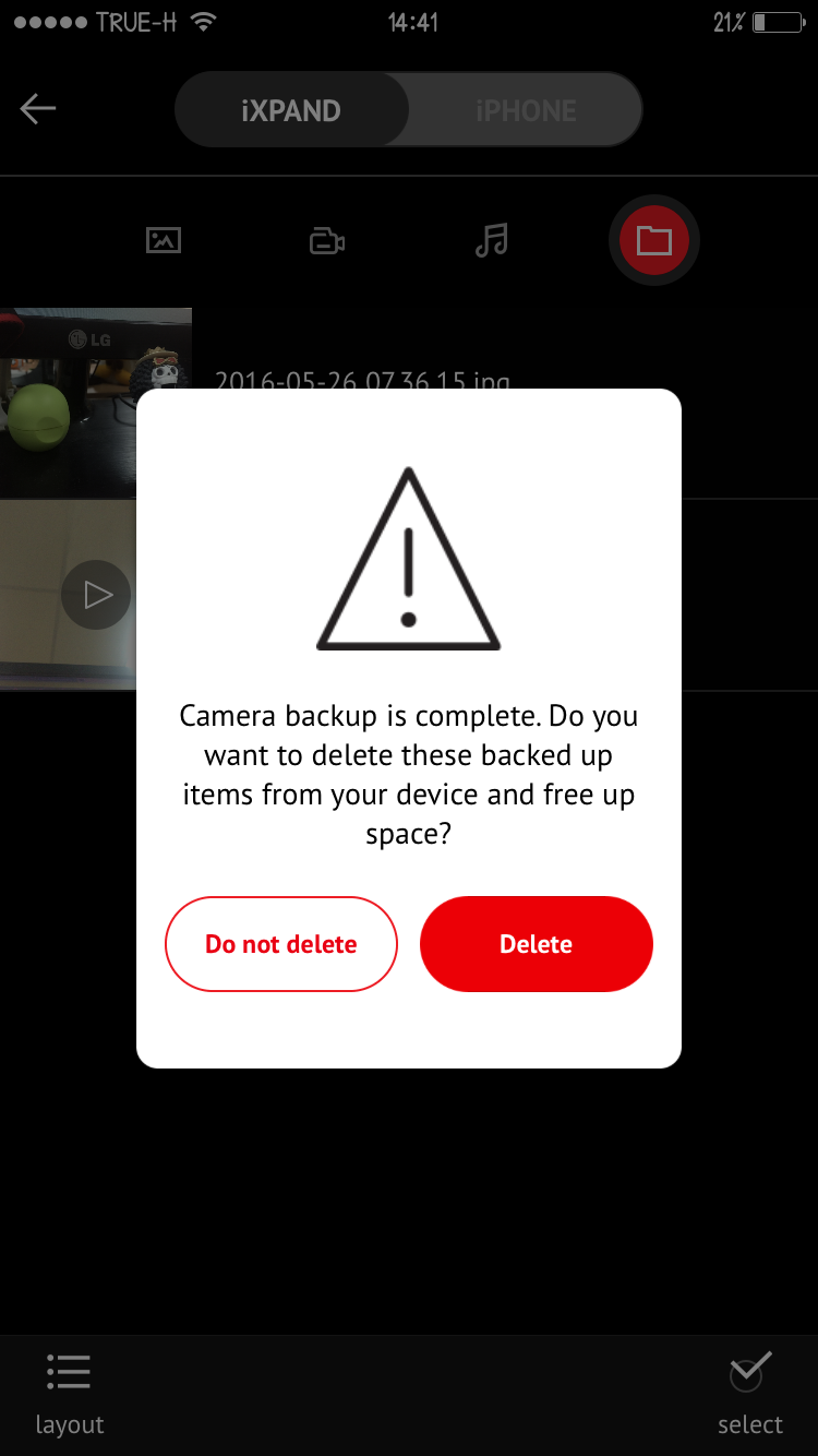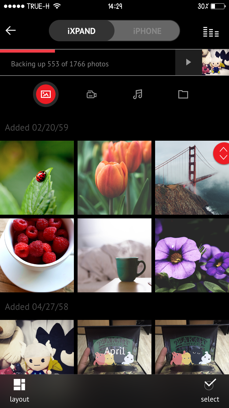 ในภาพซ้าย ตรงแถบด้านบนในหน้าจอแอป จะมีการแสดงความก้าวหน้าในการแบ็กอัพไฟล์ภาพถ่าย และคลิปวิดีโอจาก iPhone/iPad มาเก็บไว้ในไดร์ฟ iXpand โดยไฟล์ที่แบ็กอัพจะถูกเก็บแยกโฟลเดอร์ตามปี และเดือนที่เราถ่ายมา ทำให้ค้นหาได้ง่ายๆ