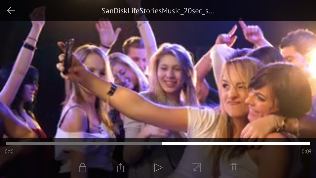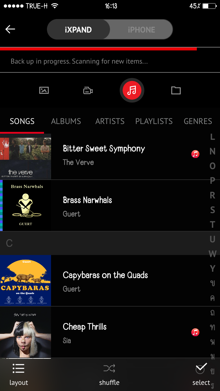 สำหรับคนที่ชอบดูหนังฟังเพลง แต่ก็กลัวว่าถ้ายัดไฟล์เข้าไปใน iPhone/iPad เยอะๆ ก็กลัวว่าเมมจะเต็มเร็ว หรือไม่ก็เจอปัญหาเมมเครื่องเต็มจนไม่สามารถยัดไฟล์เพลง หรือไฟล์วิดีโอใหญ่ๆ ลงไปในเครื่องได้อีก iXpand แก้ปัญหาให้ได้โดยการ เก็บไฟล์เพลง และไฟล์วิดีโอใหญ่ๆ ไว้ในตัวไดร์ฟได้เลย การเปิดเล่นเพลง/วิดีโอที่อยูในไดร์ฟก็ทำได้โดยตรงผ่านแอป iXpand Drive ซึ่งสามารถเล่นได้ทั้งไฟล์เพลง/วิดีโอ ทั้งที่อยู่ในตัวไดร์ฟ รวมถึงเล่นไฟล์ที่เก็บอยู่ใน iPhone/iPad ได้ด้วยนะ โดยในภาพขวา การเรียงรายชื่อเพลง สามารถเลือกให้เรียงตาม อัลบั้ม, ศิลปิน หรือแนวเพลงได้ตามต้องการ และมีการโชว์หน้าปกในขณะเล่นเพลง (ภาพขวา)