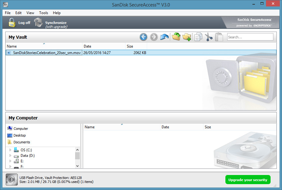 เมื่อเสียบ SanDisk iXpand เข้ากับพอร์ท USB ของเครื่องคอมฯ ก็จะมองเห็นเป็นแฟลชไดร์ฟตัวหนึ่งตามปกติ สามารถโอนไฟล์ ก๊อปปี้ไฟล์มาเก็บไว้ในคอมฯ ได้ และสำหรับการเข้าถึงไฟล์ลับที่เก็บไว้ในตู้เซฟ ให้ดับเบิ้ลคลิกที่ไอคอน SanDiskSecureAccessV3_win.exe
