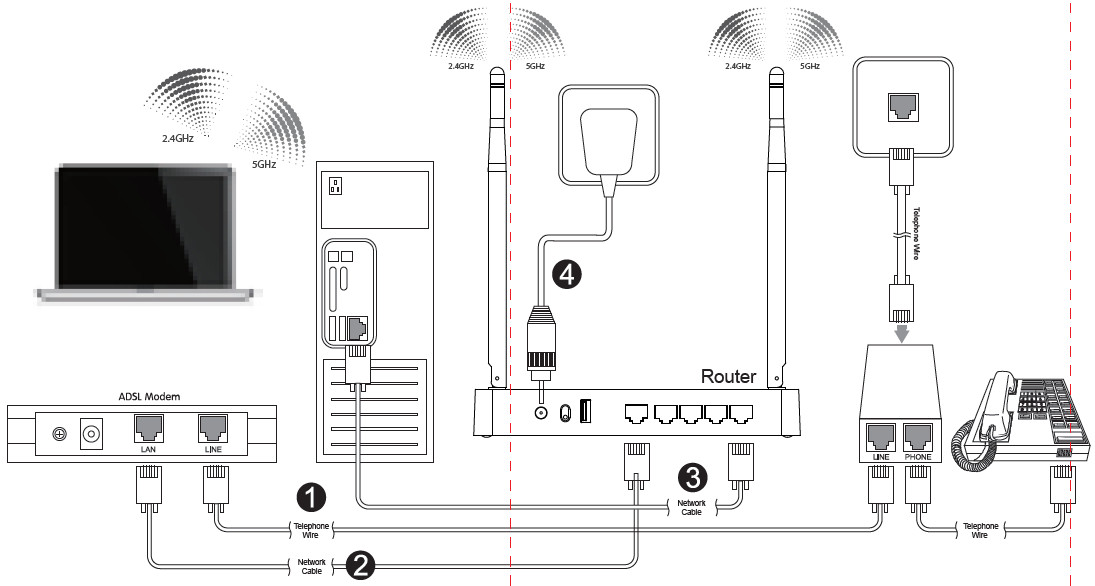 อันดับแรกก็ต้องทำการติดตั้ง Totolink A2004NS เข้ากับระบบเครือข่ายตามภาพด้านล่าง จะเห็นว่ามันไม่สามารถเชื่อมต่อกับสายโทรศัพท์ได้โดยตรง โดยสายโทรศัพท์ยังคงเสียบเข้ากับ ADSL โมเด็มตามเดิม และเราต้องเชื่อมต่อ Totolink A2004NS เข้ากับโมเด็มผ่านสาย LAN และในส่วนของสาย LAN จากคอมหรือโน้ตบุ๊ค ที่เดิมเคยเสียบเข้ากับตัวโมเด็มเราเตอร์ เราก็ต้องย้ายมาเสียบเข้ากับ Totolink A2004NS แทนครับ