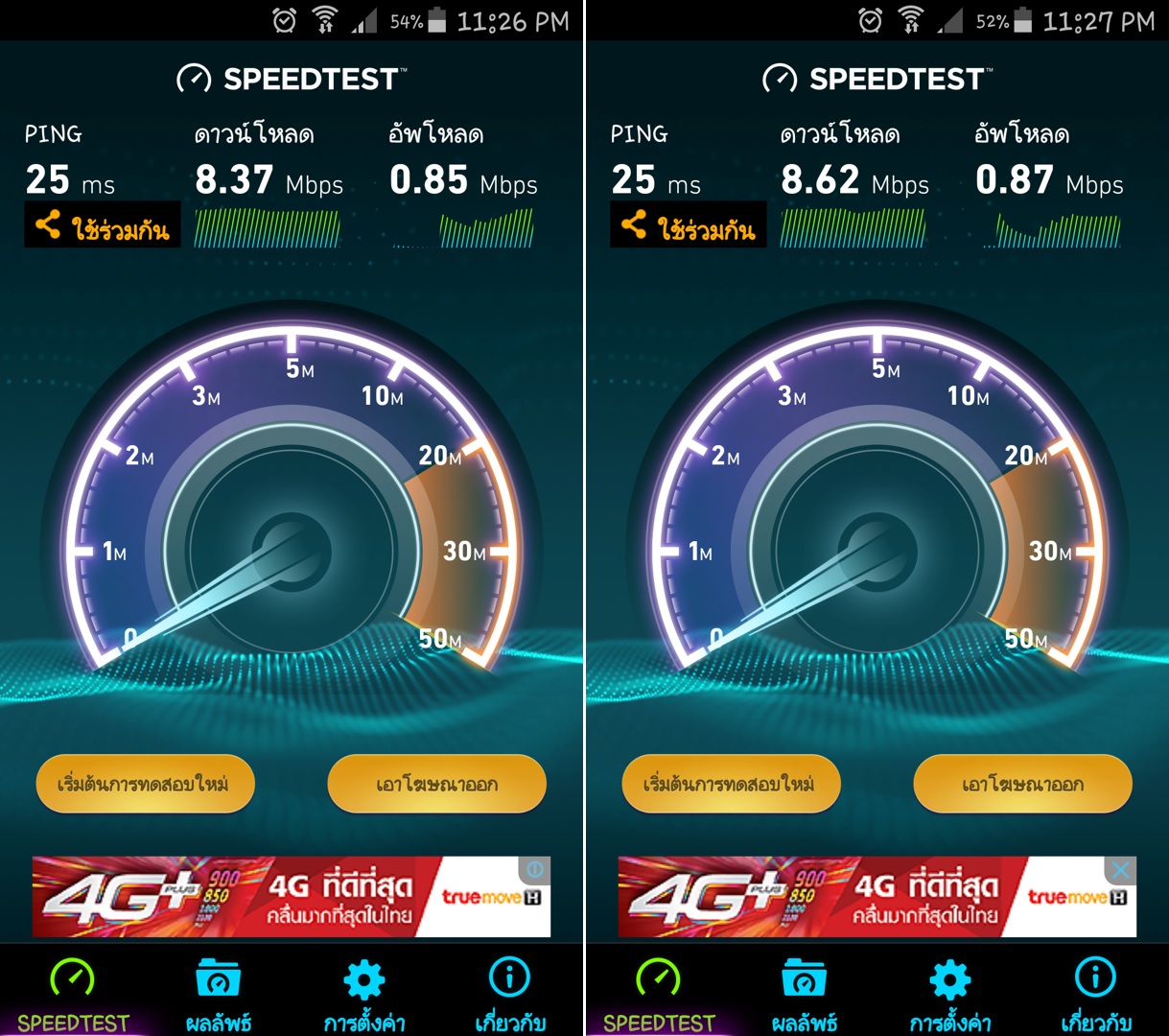 โดยภาพซ้ายเป็นการเชื่อมต่อที่ความถี่ 2.4GHz (ดาวน์โหลด 8.37Mbps / อัพโหลด 0.85Mbps) พบว่าทั้งความเร็วการ ดาวน์โหลด/อัพโหลด ต่ำกว่าภาพขวา ที่เชื่อมต่อ Wi-Fi 5GHz อยู่เพียงเล็กน้อย (ดาวน์โหลด 8.62Mbps / อัพโหลด 0.87Mbps)