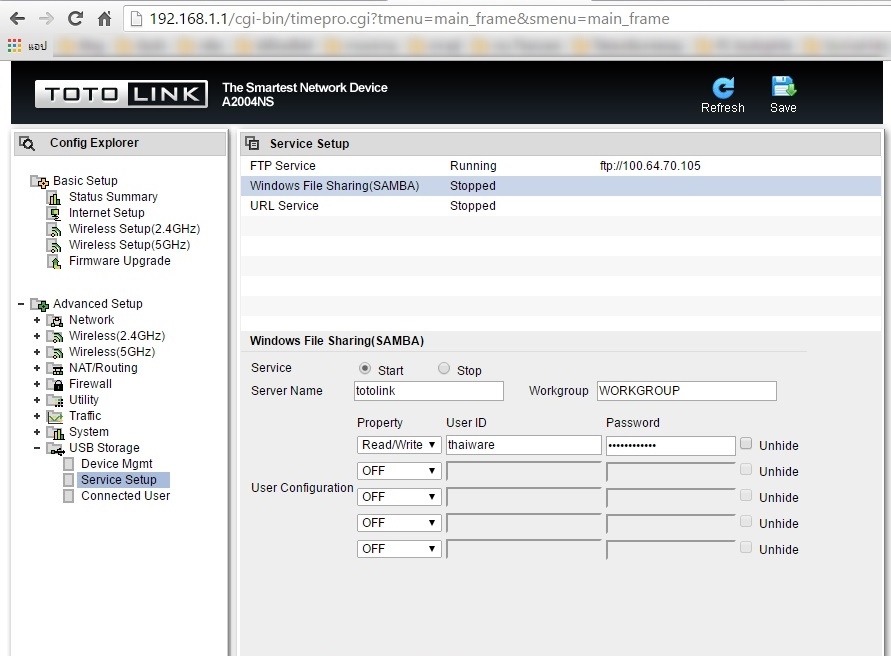 เรามาดูวิธีการเซ็ตอัพ File Sharing กันก่อน ในแถบซ้ายของหน้าจอ ให้คลิกที่ Advanced Setup > USB Storage > Service Setup ให้คลิกที่ Windows File Sharing (SAMBA) ก็จะเข้าสู่หน้าจอการเซ็ตอัพ เราสามารถกำหนด User ID และ Password ให้กับผู้ที่จะเข้ามาใช้งาน File Sharing ได้ รวมถึงสามารถกำหนดสิทธิ์ (Property) ได้ว่า จะให้ User ID ไหมสามารถเปิดและแก้ไขไฟล์ได้ (Read/Write) หรือจะให้ User ID ไหนสามารถเปิดดูไฟล์ได้อย่างเดียว (Read)