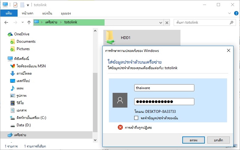 เมื่อจะเข้าใช้งานโฟลเดอร์ที่เปิดแชร์ไฟล์ไว้ผ่าน Totolink ก็ต้องทำการป้อน Uesr ID และรหัสผ่าน