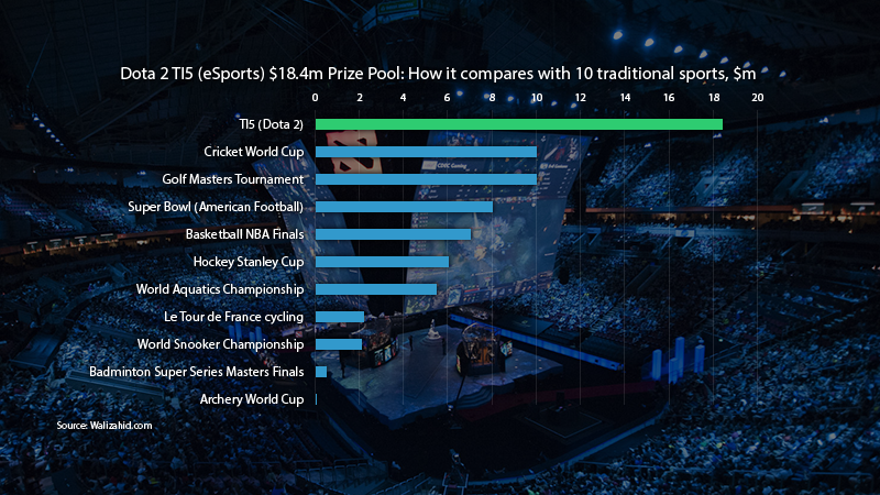 ของแบบนี้ก็มีด้วยหรือ นักกีฬาเล่นเกมส์ คนที่ยึดการเล่นเกมส์เป็นอาชีพ ต้องบอกเลยว่านี่คือเรื่องจริงครับ การเล่นเกมส์ในรูปแบบของกีฬา มีการฟอร์มทีม มีการฝึกซ้อม มีระบบการแข่งขันอย่างเป็นมาตรฐาน สิ่งเหล่านี้เรียกรวมกันว่า E-Sport (Electronic Sport กีฬาอิเล็กทรอนิกส์) ที่สร้างชื่อเสียง และสร้างรายได้ให้กับนักกีฬาที่อยู่ในแวดวงนี้อย่างเป็นกอบเป็นกำ แต่ก็มีข้อแม้ว่าคุณต้องเล่นเกมส์เก่ง และได้อยู่ในทีมที่ดีด้วยนะ ดูจากกราฟด้านบน เปรียบเทียบเงินรางวัลในรายการแข่งขันเกมส์ DotA 2 – The International 2015 ซึ่งมียอดเงินรางวัลรวมสูงสุดเป็นประวัติการณ์ถึง $18,429,613 คือประมาณ 650 ล้านบาทเลยทีเดียว!!! นำโด่งแซงเงินรางวัลในการแข่งขันกีฬาอื่นๆ อย่างเช่น กีฬาคริกเก็ต (Cricket World Cup) หรือกีฬากอล์ฟ (Golf Masters Tournament) ไปหลายช่วงตัวเลยทีเดียว บอกเลยว่ากีฬาเล่นเกมส์เป็นเรื่องจริง และในหลายประเทศมีนักกีฬา E-Sport ที่ทุ่มเทกับการเล่นเกมส์เป็นอาชีพอย่างจริงจัง รวมถึงในประเทศไทยด้วย