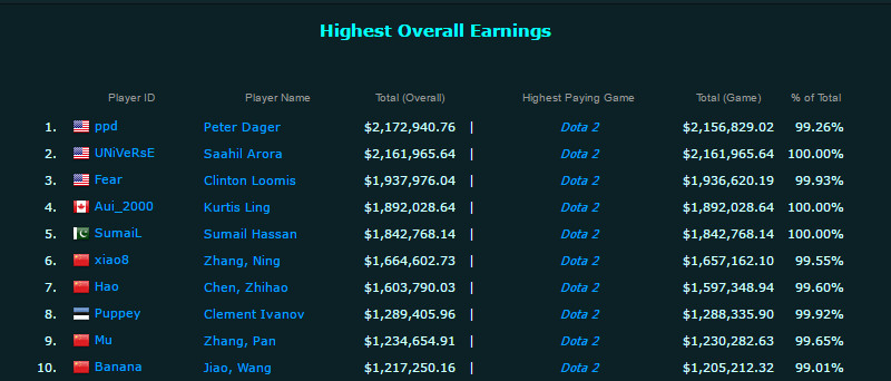 10 อันดับนักกีฬา E-Sport ที่ทำรายได้สูงสุดของโลกในปี 2015 (ที่มา www.esportsearnings.com)