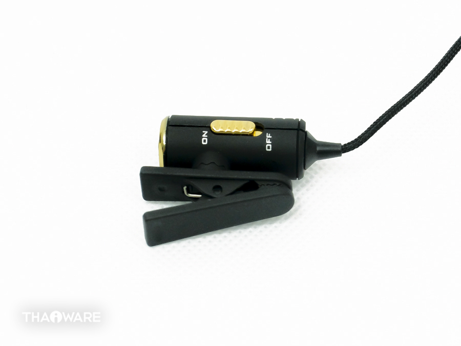 | ด้านข้างไมค์ ทางด้านซ้ายของตัวโลโก้ ประกอบไปด้วยปุ่มสวิตซ์เปิด-ปิด สีทองที่ดูโดดเด่นออกมาจากตัวบอดี้ไมค์สีดำ เช่นเดียวกับลายบนหัวไมค์ โดยส่วนตัวคิดว่า สีทองทำให้ความเท่ตามสไตล์เกมมิ่งเกียร์ลดลงเล็กน้อย อยากให้เป็นสีแดงสด อะไรประมาณนั้นมากกว่า |