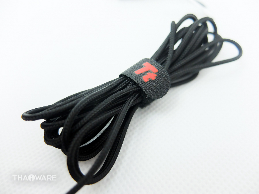 | สายของ CHAO ECHO มีลักษณะเป็นสายถักที่ดูแข็งแรง ทนทาน มีความยาว 2.7 เมตร ที่สามารถต่อสายไมค์โยงมาจากด้านหลังเคสพีซี ได้อย่างสะดวกสบาย ไม่ต้องหาสายมาพ่วงต่อ มีสายรัดตีนตุ๊กแกโลโก้ Tt ไว้รัดเก็บสายที่เกินมาให้เรียบร้อยได้ |