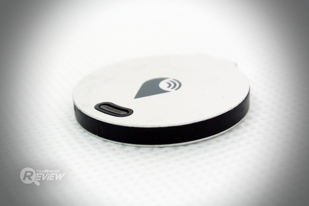 หน้าตาการใช้งานของ TrackR Bravo มีปุ่มสีดำให้กด (ผมใช้เล็บจิก) ถ้าตัวเครื่องส่งสัญญาณ Bluetooth ตอน Pairing จะมีไฟกระพริบสีฟ้าตรงปุ่มสีดำนี้