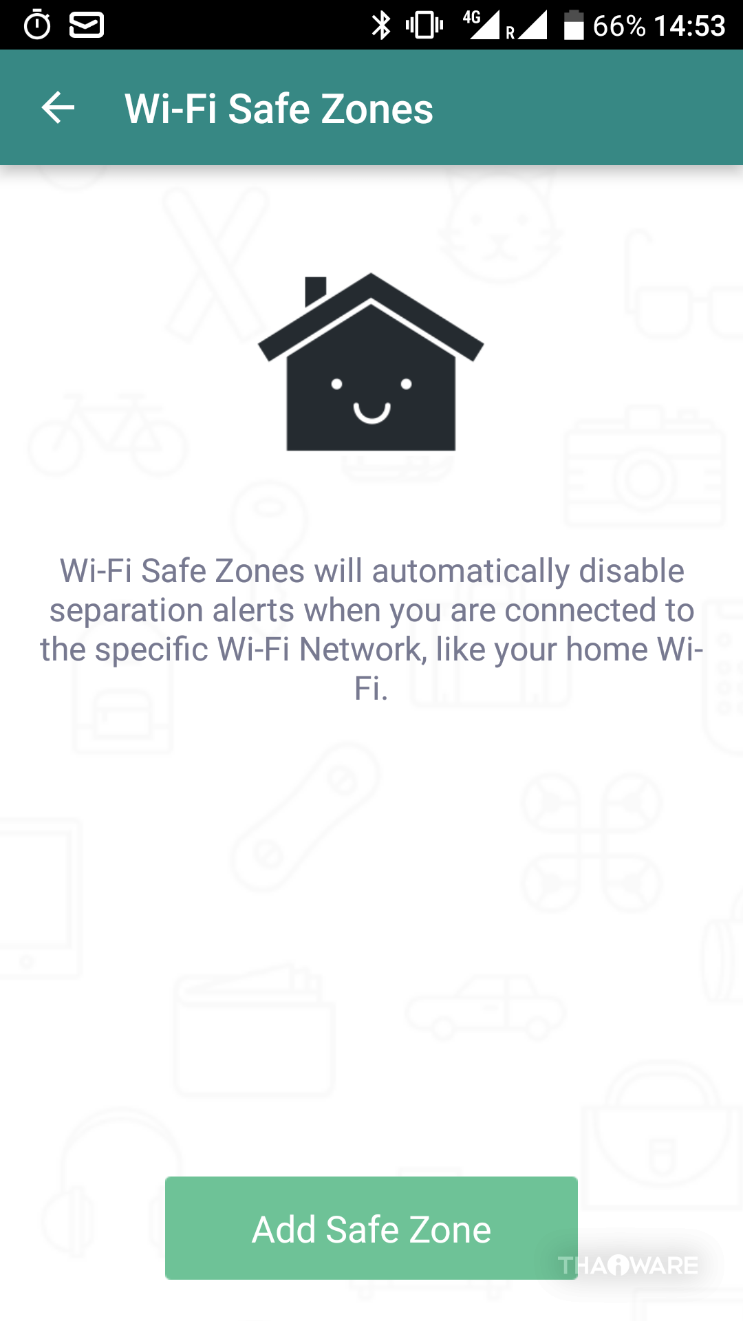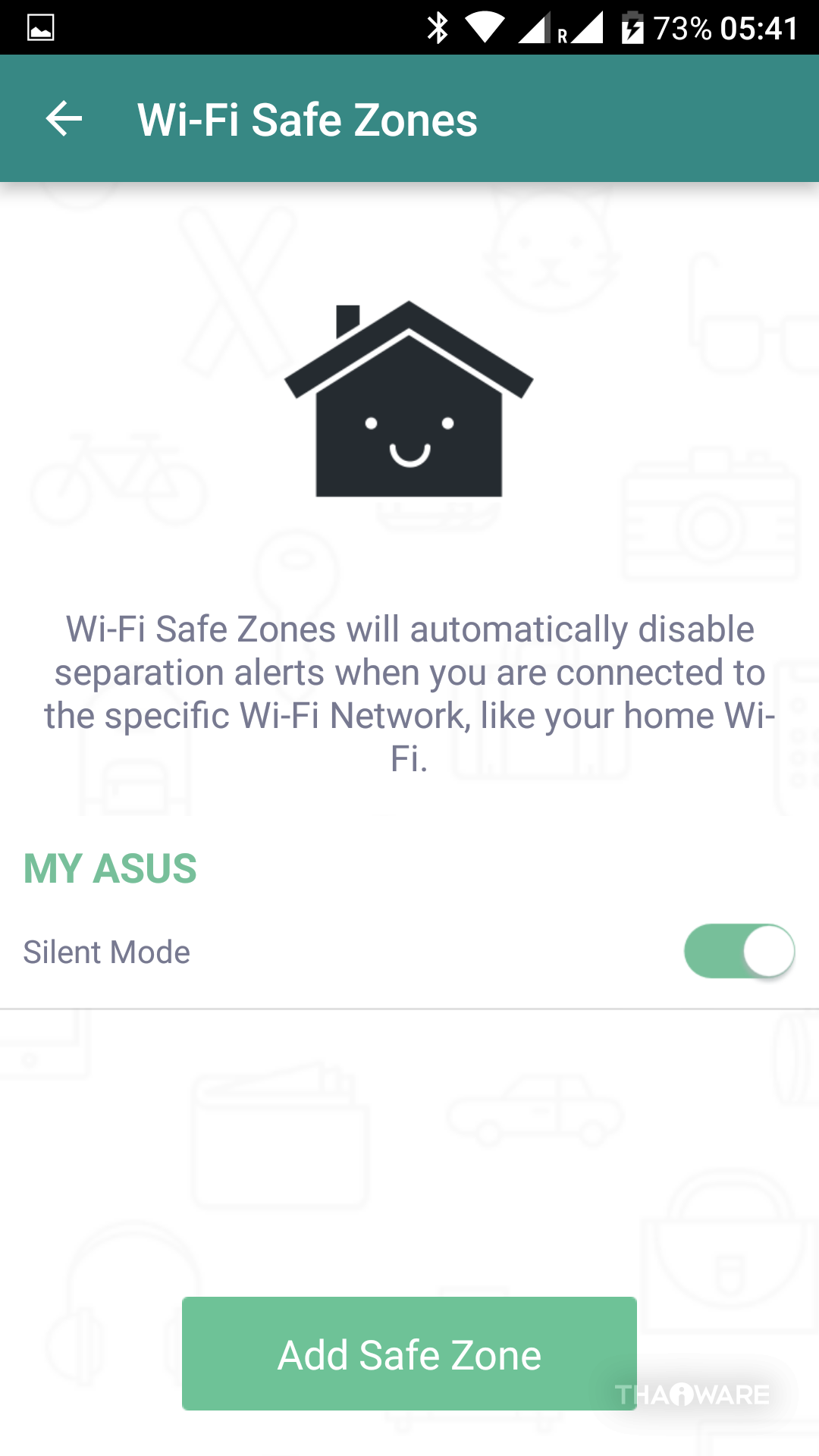 คือแบบนี้ครับ ปกติเวลาเราอยู่ข้างนอก เจ้าแอป TrackR ก็ทำหน้าที่ของมันอย่างซื่อสัตย์ ไม่ว่าจะต่อ 3G 4G Wi-Fi แต่ถ้าเราอยู่บ้าน หลายคนมักจะเชื่อมต่อ Wi-Fi บ้าน แทนการใช้เน็ตมือถือ แล้วถ้าวางกระเป๋าตังไว้ข้างล่าง ขึ้นไปนอนชั้นบน ระบบต้องแจ้งเตือนตามหน้าที่ของมัน แต่เราสามารถกำหนดค่าได้ว่า เมื่อใดก็ตาม ที่เข้าโซน Wi-Fi ที่กำหนดนี้ Wi-Fi Safe Zone จะกำหนดให้แอป Disable การแจ้งเตือน (ในขณะที่คุณเชื่อมต่อ Wi-Fi เฉพาะ SSID อันนี้) ทำให้เราวางกระเป๋าสตางค์ไว้ตรงไหนของบ้านก็ได้ วางแยกกับมือถือก็ได้ ไม่มีเสียงเตือน เฉพาะตอนที่เชื่อมต่อ Wi-Fi บน Safe Zone ที่เรากำหนด